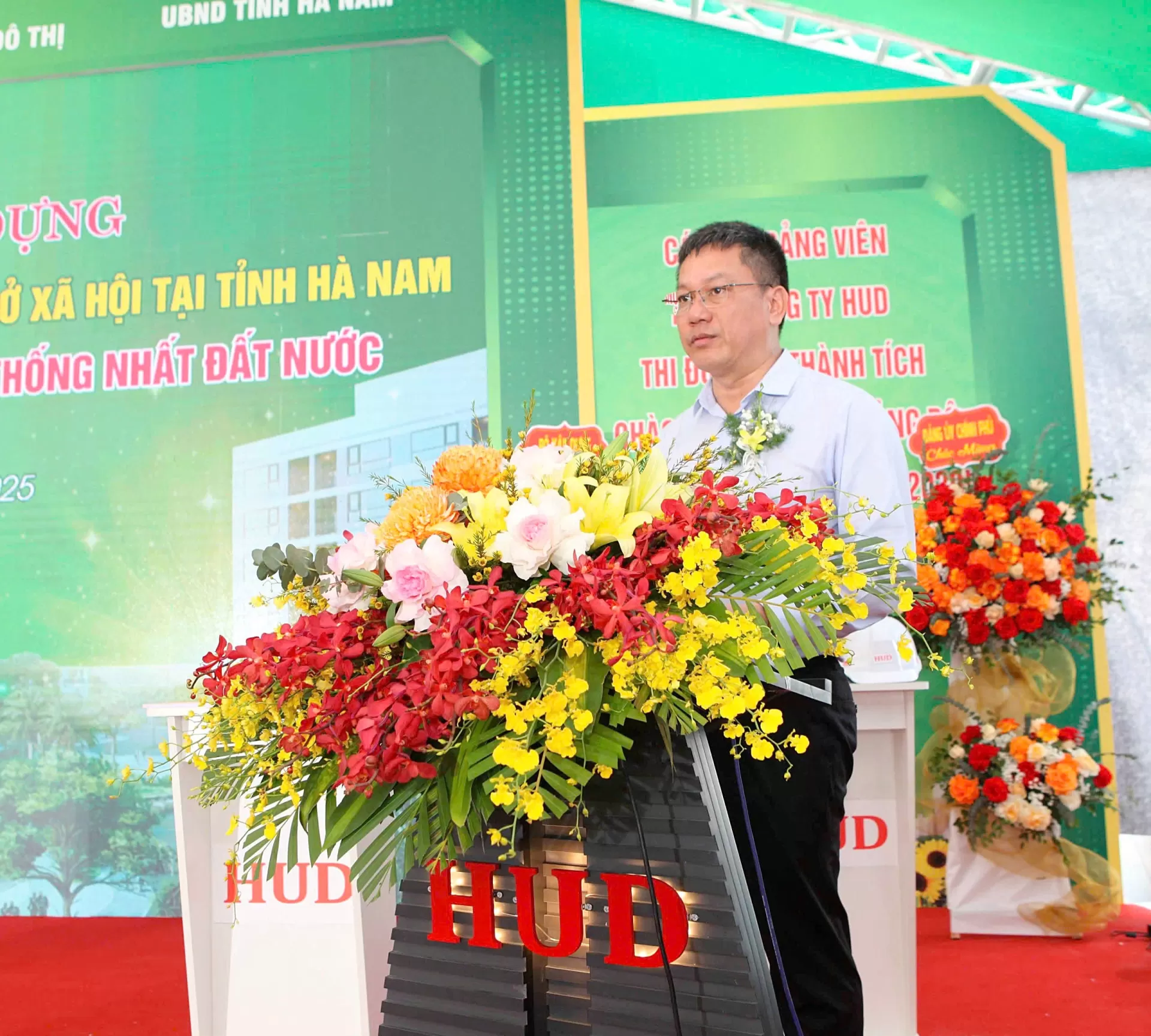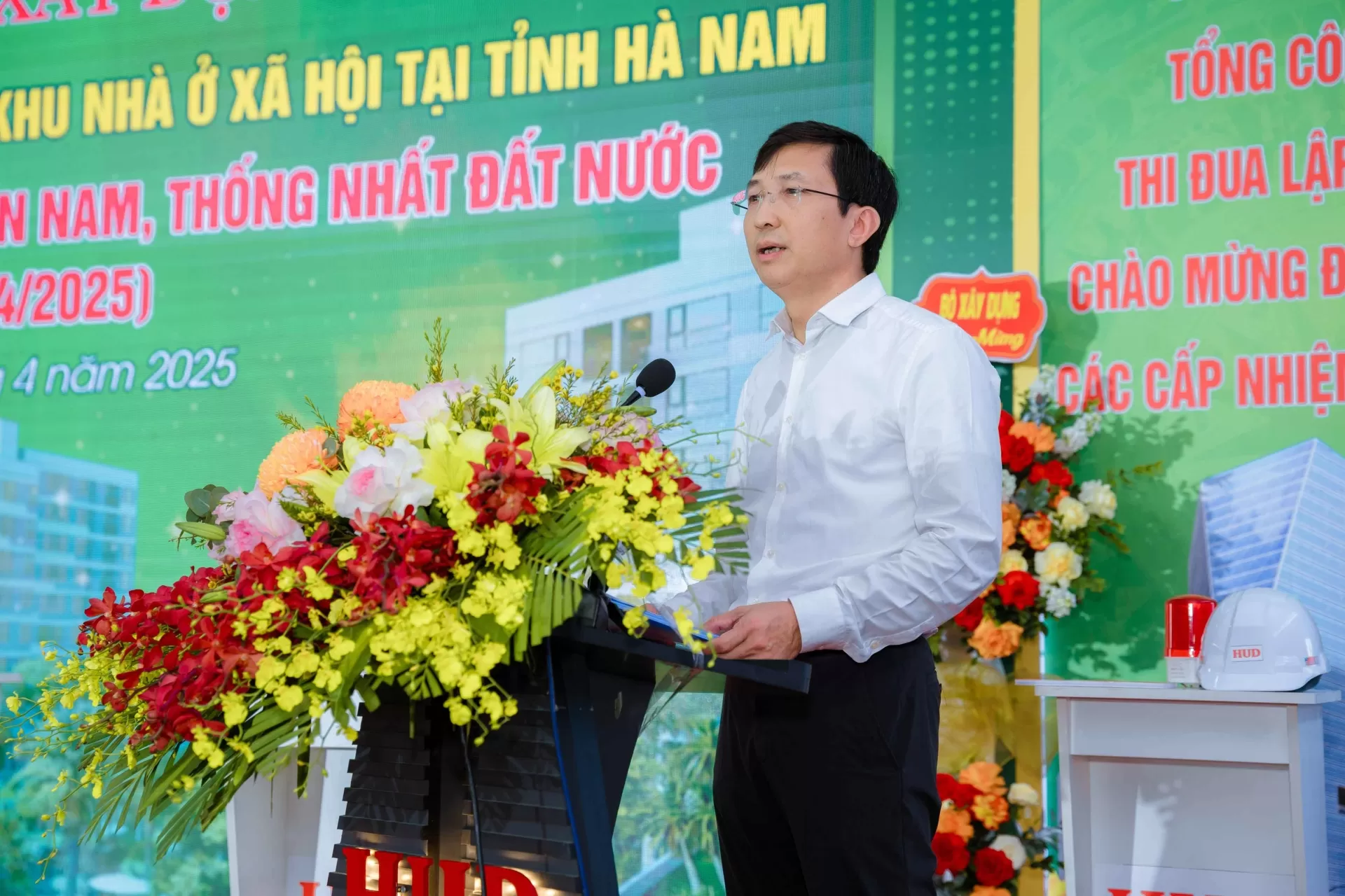 Phát biểu tại buổi lễ, đồng chí Đậu Minh Thanh - Ủy viên Ban chấp hành Đảng bộ Chính phủ, Bí thư Đảng ủy, Chủ tịch Hội đồng thành viên Tổng công ty HUD tiếp thu những ý kiến chỉ đạo của lãnh đạo cấp trên, đồng thời tin tưởng rằng, với sự quan tâm tạo điều kiện của các cấp, các ngành, với tinh thần quyết tâm cao của Tổng công ty, với sự nỗ lực của các đơn vị có liên quan tập trung mọi nguồn lực để thực hiện, dự án đầu tư xây dựng Khu NOXH tại phường Đồng Văn, thị xã Duy Tiên, tỉnh Hà Nam sẽ được hoàn thành đúng kế hoạch, tiếp tục thể hiện vai trò tiên phong của HUD trong việc thực hiện chủ trương, chính sách của Đảng và Nhà nước về phát triển nhà ở xã hội.